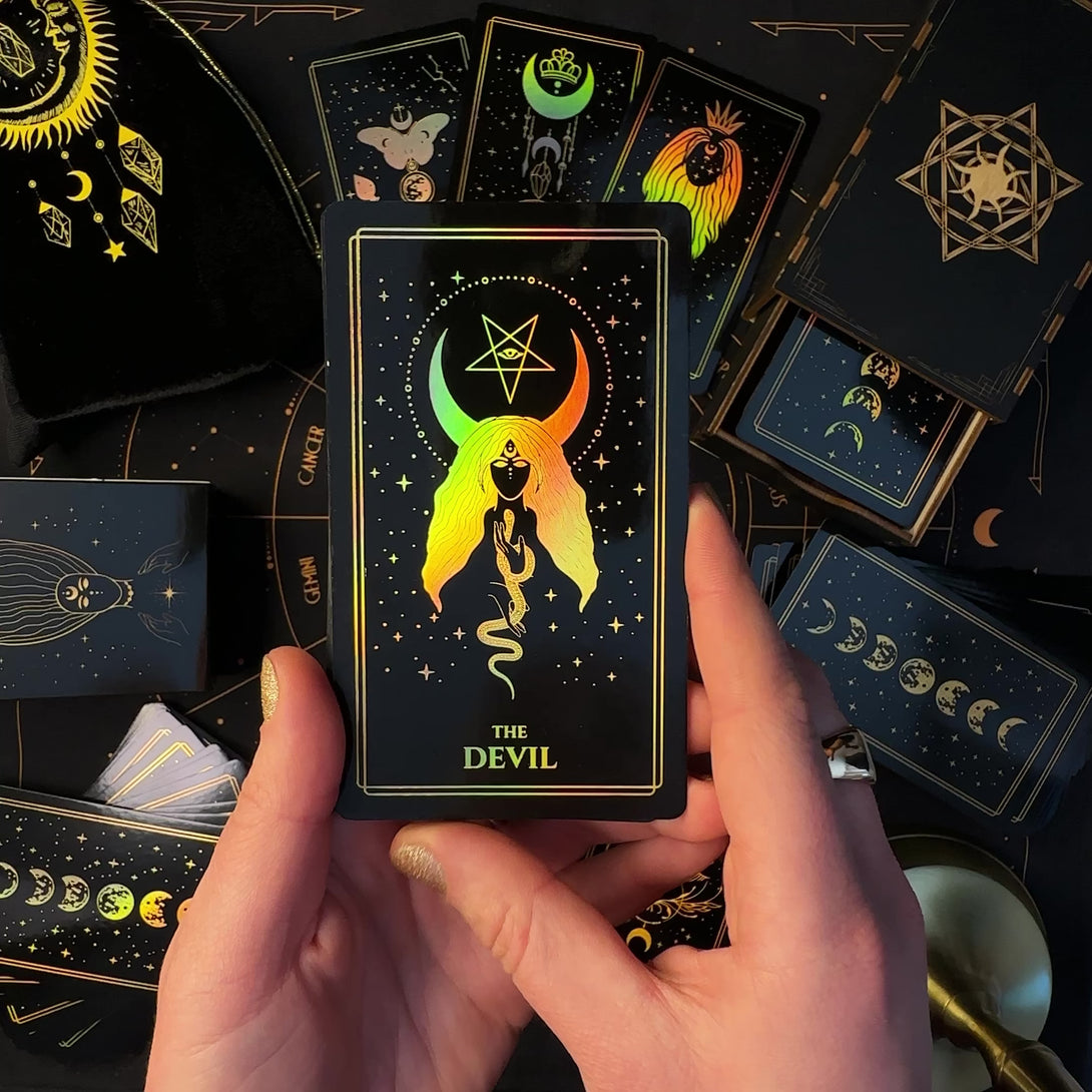 Embark on an enchanting tarot journey with the Gold Rainbow Foil Moonlight Tarot Deck. This captivating deck features luminous gold and rainbow foil designs printed on premium 300GSM art cardstock.